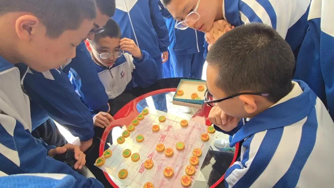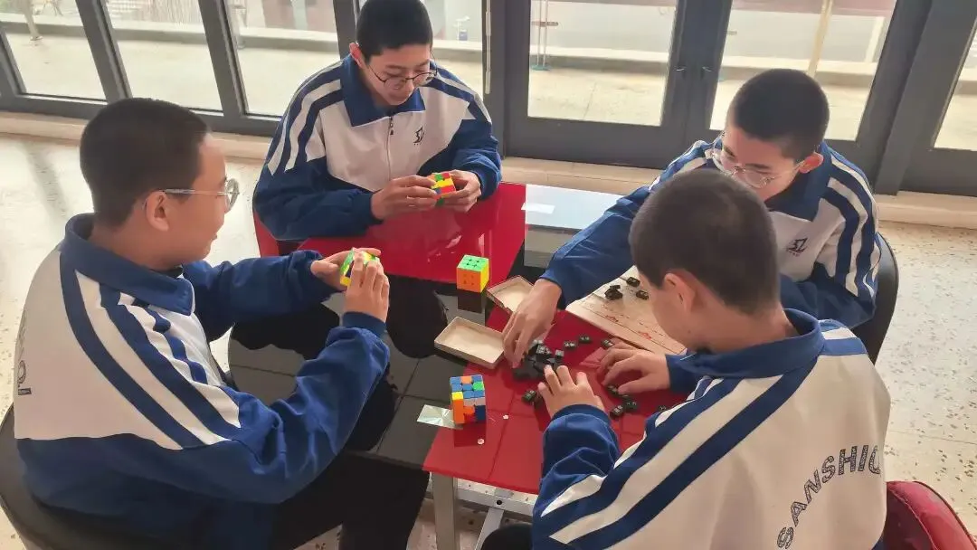 与此同时,益智活动区的同学们两两对坐,下象棋、下军棋,楚河汉界间博弈智慧,落子有声中尽显思维;玩魔方的同学指尖翻飞,快速还原色块的过程里,专注力与逻辑力悄然提升。