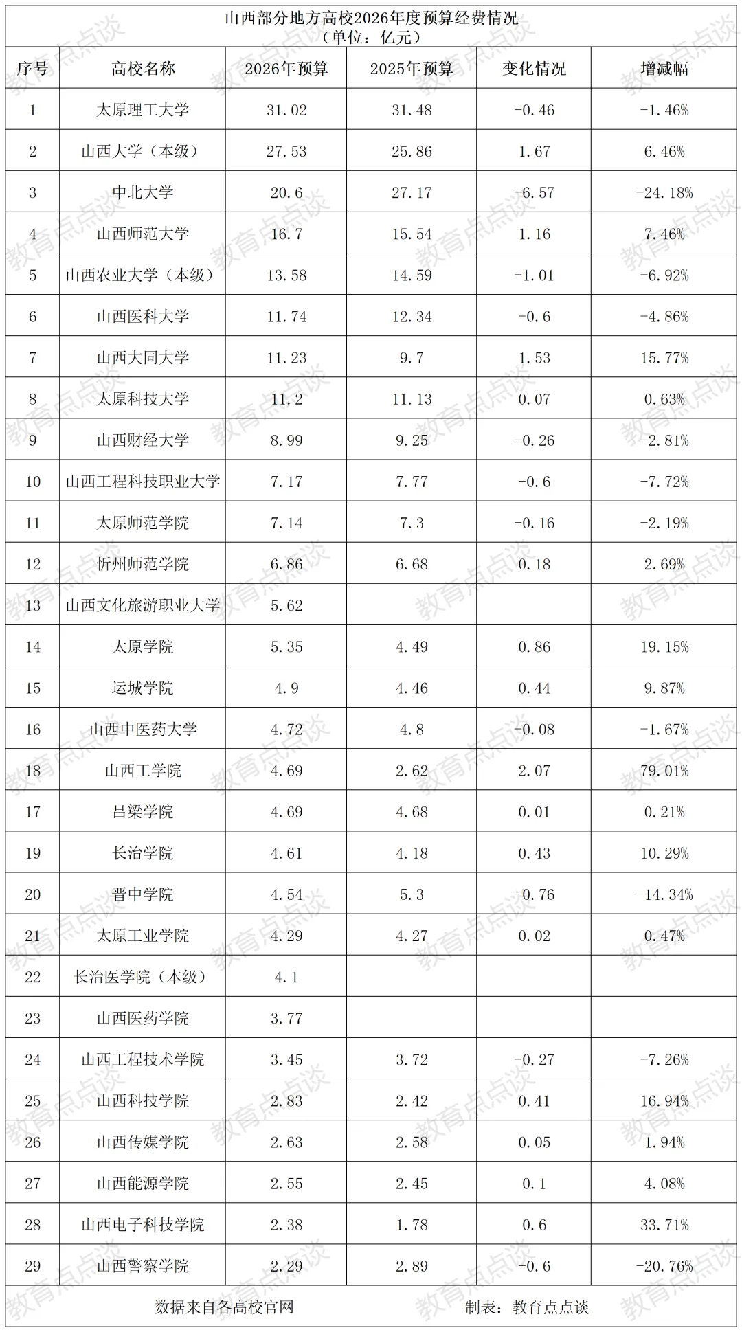 山西各本科院校公布了2026年经费预算,共有8所高校预算超过10亿,其中太原理工大学31.02亿位居榜首、山西大学(本级)27.53亿列第2位、中北大学20.6亿列第3、山西师范大学16.7亿列第4位、山西农业大学(本级)13.58亿列第5位、山西医科大学11.74亿列第6位、山西大同大学11.23亿列第7位、太原科技大学11.2亿列第8位。
