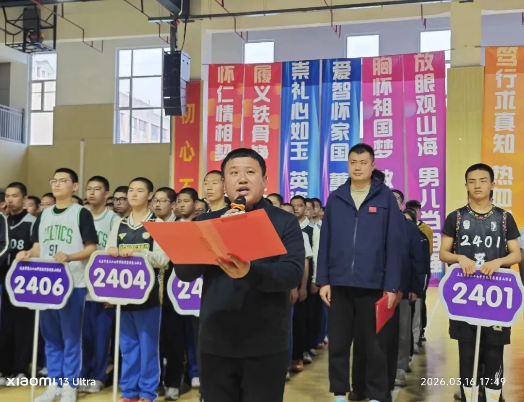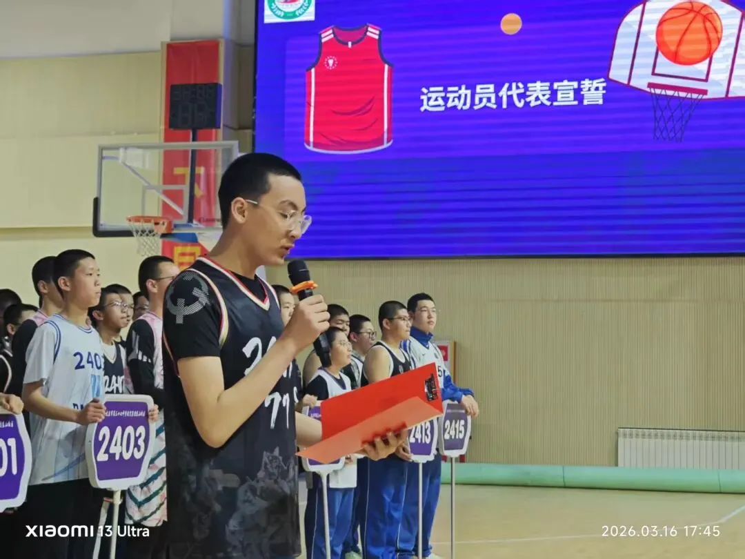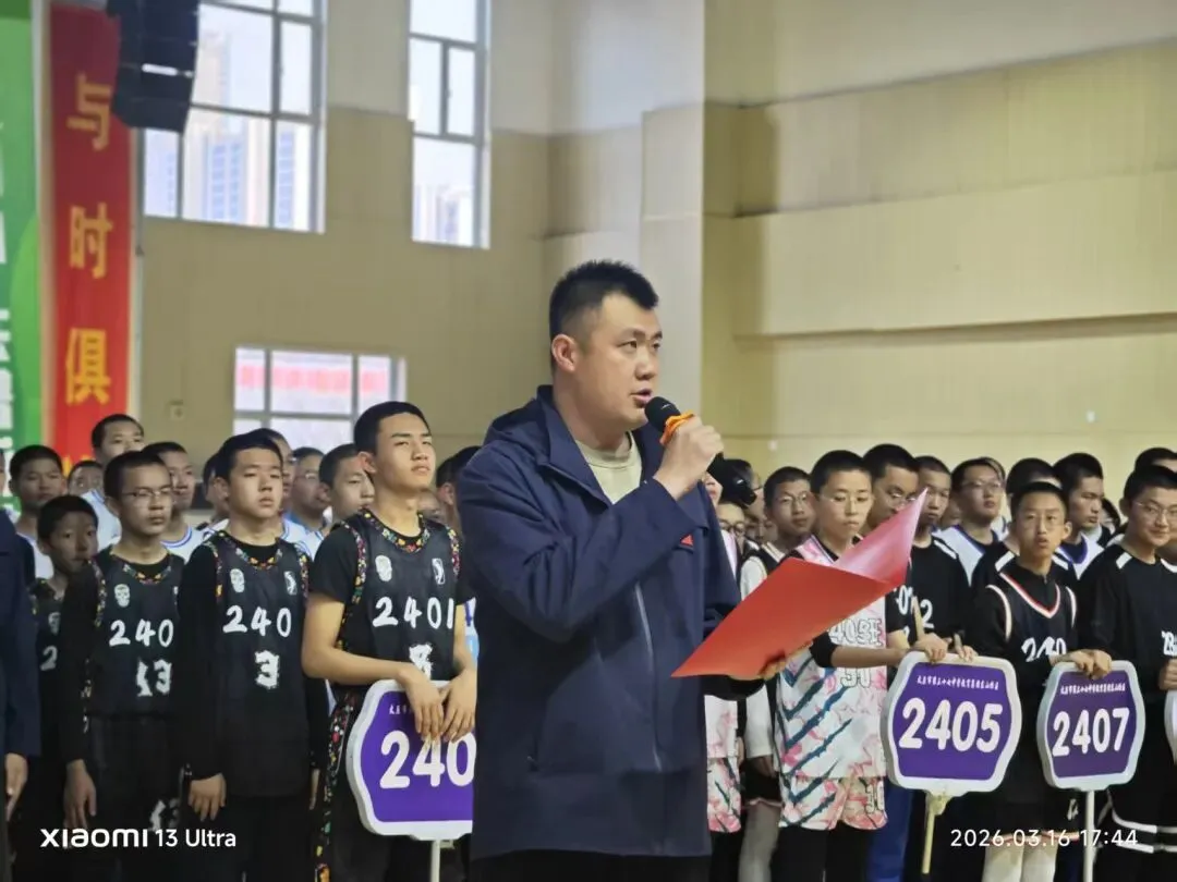 热烈掌声中,张佳佳校长以“以志为炬 以篮逐光”为主题致辞。他表示,篮球是团队运动,更是意志的较量,初二学子正处于拔节生长的关键期,更应展现三七学子的精神风貌。校长寄语少年们以赛砺志、以赛明礼、以赛聚力,将赛场的拼搏与协作融入学习生活,成长为有志向、有担当的新时代三七少年。