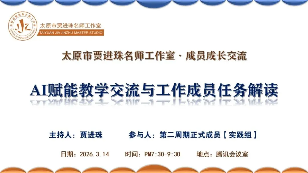 3月14日晚,太原市贾进珠名师工作室召开“AI赋能教学交流与工作成员任务解读”主题会议。会议由工作室主持人贾进珠老师主持,刘国、颜赫、闫晋清、张毅4位老师和35位学员参加。邹晨霞、郭霞、梁晓燕等8位核心成员参与交流,围绕微课制作规范、AI教育应用场景及3月专项任务展开深入探讨。