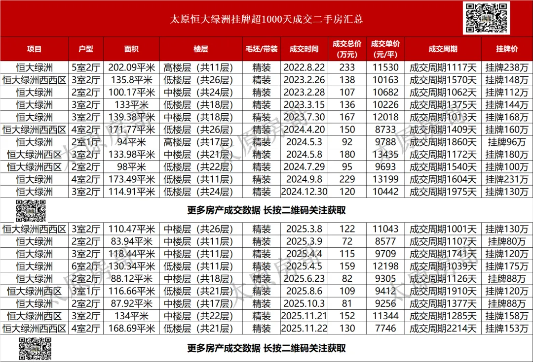 定期整理太原恒大绿洲挂牌超1000天成交的二手房数据,这次统计的数据周期是2022年1月1日到2025年12月31日,共成交25套。