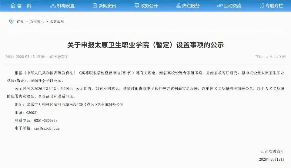 山西省教育厅于2026年3月13日发布公示,拟申报设置太原卫生职业学院(暂定),公示期为3月13日 —3月19日。
