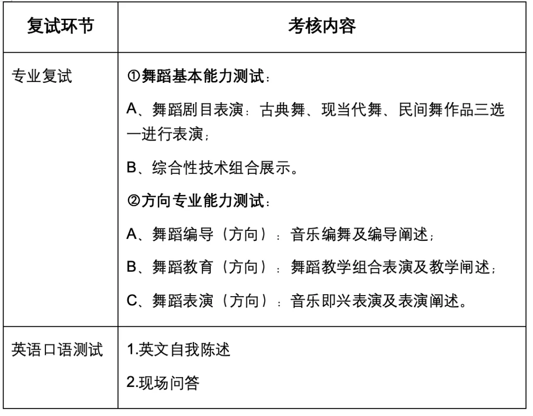 复试分为专业复试(90%)、英语口语测试(10%)、同等学力加试(不计入总分)三部分,所有考核环节均围绕舞蹈专硕三大研究方向展开,侧重实践能力与综合素养: