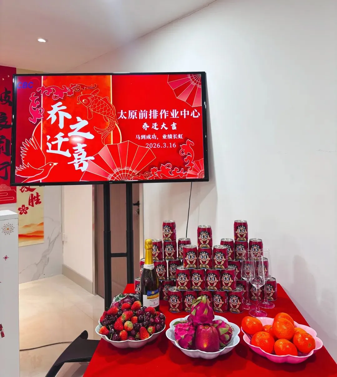 从前期筹备到正式搬迁,每一处细节都倾注着用心与温度:喜庆的红色布幅、循环播放的影像瞬间、摆满鲜果与蛋糕的长桌,无一不是对“新家”最温柔的告白。