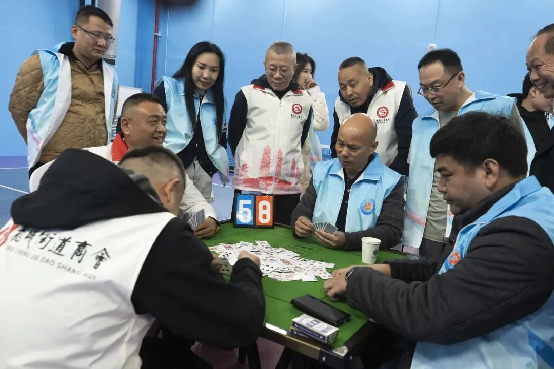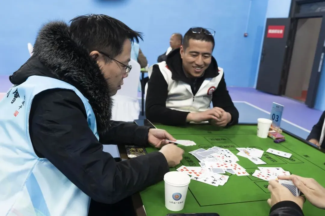 与此同时,掼蛋桌前也是另一番热闹景象。参赛选手们两两结对、默契搭档,围坐桌前沉着应对、从容博弈。大家时而低声交流战术,时而从容斟酌牌型,眼神间的默契、言语间的配合,尽显团队协作的魅力。