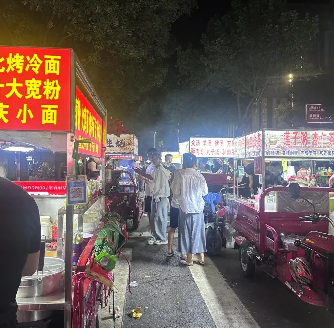 夕阳铺满街巷,灯光柔和,街边的小摊陆续点起火,炸酱、爆肚香气四散。老人坐门口撸串,聊天吹牛,孩子星星点点跑过。街道不宽,却满是人情味和熟悉感。