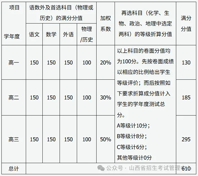 3.高中学业水平考试(会考)成绩构成:依据学生参与学年度测试选科的情况,将语数外和相关首选及再选科目的会考等级评价结果折合成分值成绩计入总分。其中“A”计5分,“B”计3分,其它等级不计分。会考计分科目总计6科,满分30分。
