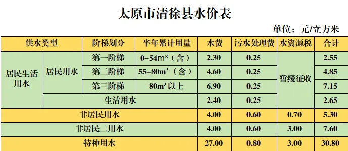 太原市六城区、清徐县、阳曲县水价表