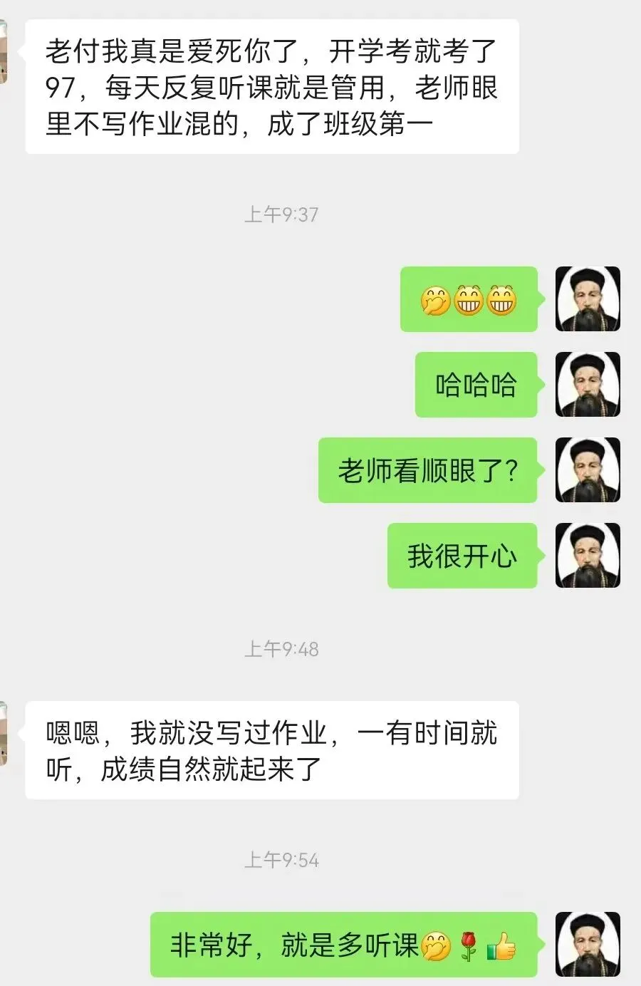 “没写过作业,一有空就听课,直接考97分班级第一!老师都刮目相看!”