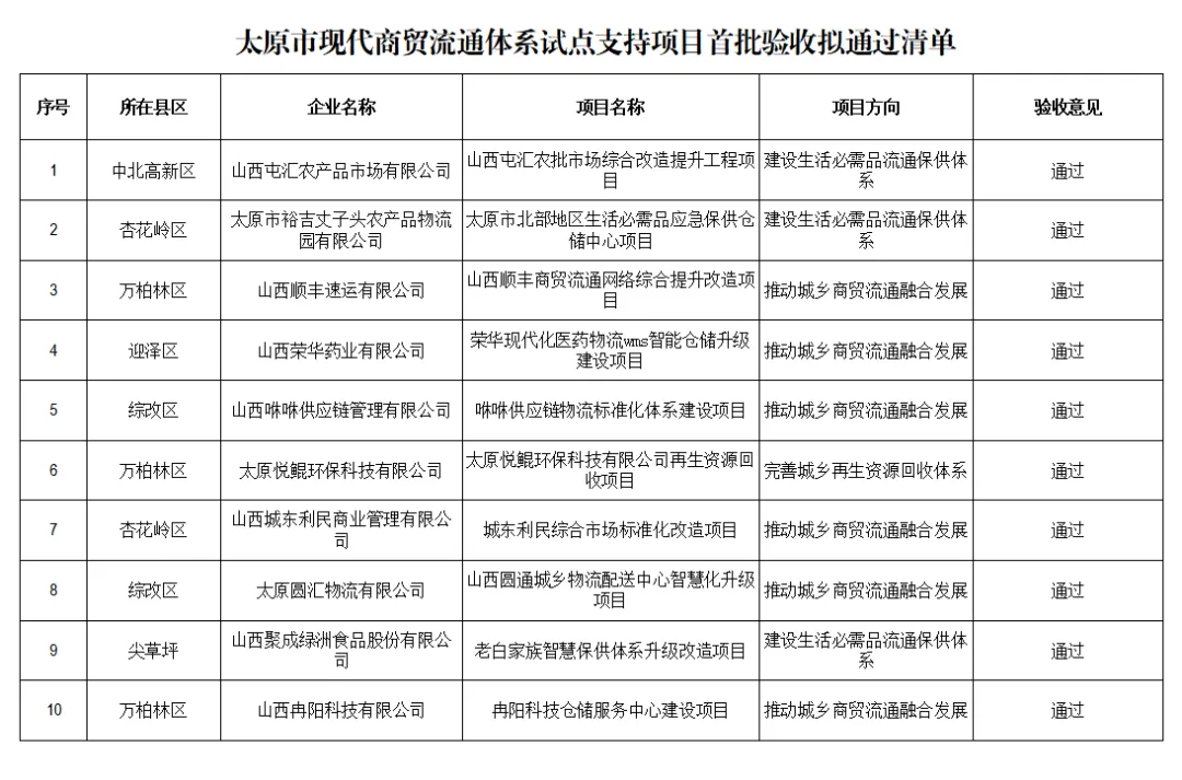关于太原市现代商贸流通体系试点支持项目首批验收拟通过清单的公示