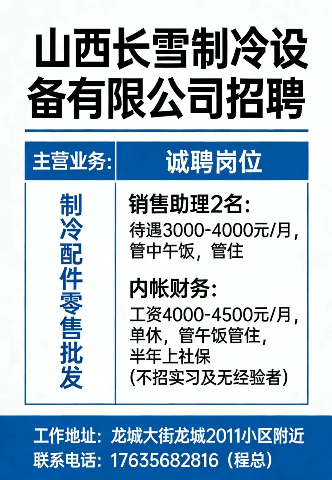 招聘岗位 1.销售人员(5名) - 岗位职责:开拓农资产品销售市场,维护客户关系,完成销售目标。 - 薪资待遇:底薪+提成+奖金+年假+社保(5000-10000/月)2. 仓库管理员(1名) - 薪资待遇:基本工资+奖金+社保(4000-5000/月)3. **财务(1名) - 薪资待遇: 基本工资+奖金+社保(3000-4000/月)4.仓库搬货打杂2名,工资面谈。*应聘方式** 联系电话:**15534070078**(翟经理) 公司地址:太原市小店区光明东街20号
