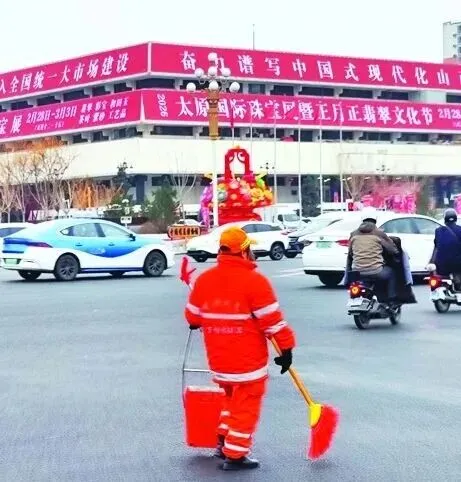 迎泽大桥就在她的前方,红旗一排排迎风招展,橙红色的身影与清晨的天空形成鲜明对比。迎泽大桥桥身整洁,路面平整,背后都是这样一群人的辛苦付出。城市的市容越来越漂亮,基础设施越来越完善,我们习以为常的整洁街道,其实是他们日复一日的坚持换来的。