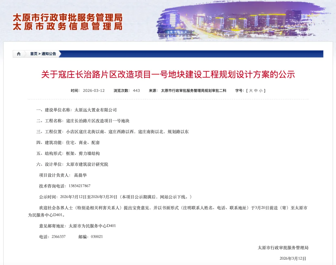 2026年3月12日,太原审批管理局发布:关于寇庄长治路片区改造项目一号地块建设工程规划设计方案的公示,也就说远大中央广场即将启动!