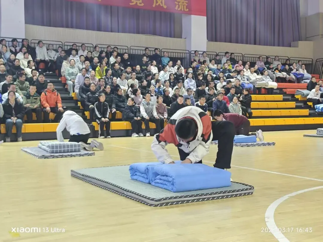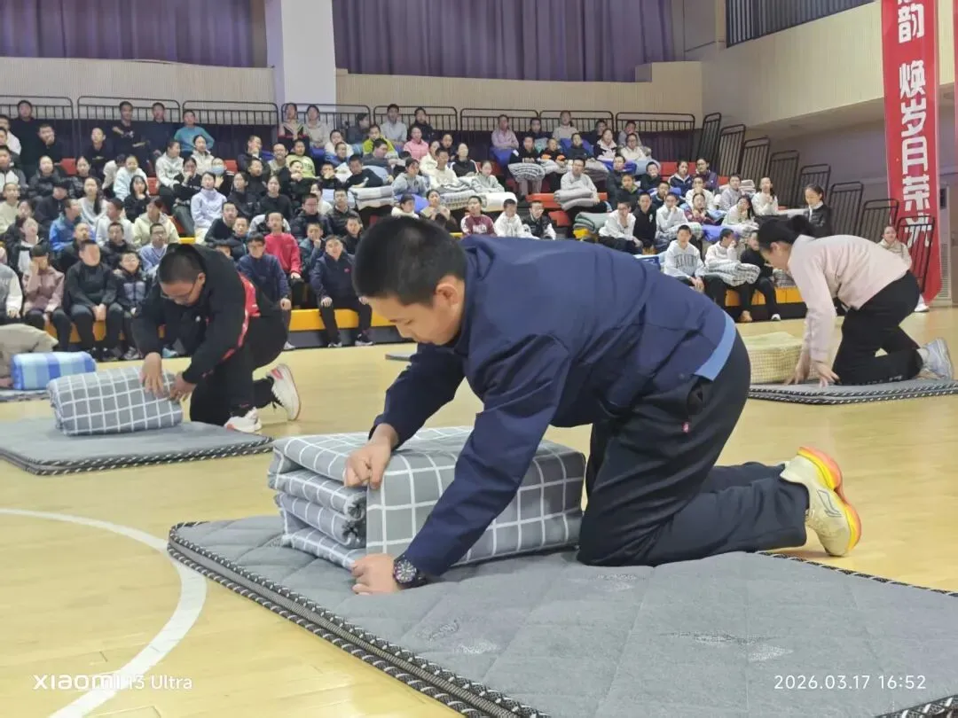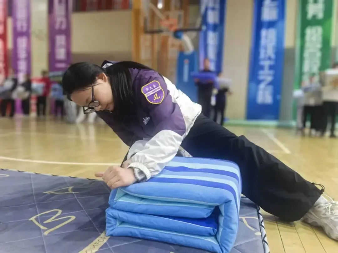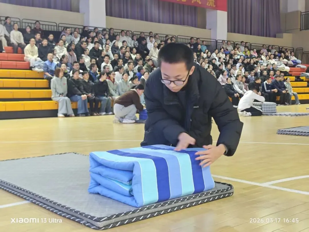 一折一叠见真章,一言一行显风采。为加强宿舍内务建设,培养学生良好生活习惯,提升动手能力与自理素养,太原市第三十七中教育集团东山校区25级初一年级举办“叠青春棱角 筑少年脊梁”叠被子大赛。3月17日下午,艺体楼掌声阵阵,全体初一学子聚集于此,叠有棱角的被子,在方寸之间展现少年风采,在点滴细节中锤炼优良品格。赛场之上,气氛热烈而有序。首先,教官宣读比赛规则与赛场纪律后,之后叠子被大赛正式拉开帷幕。各班选手依次登场,2501、2505、2509和2511班的选手率先出战,后续班级有序候场、依次比拼,整个赛程衔接紧密、井然有序。铺被、压平、对折、捏角、修边……参赛学子们动作娴熟、神情专注,每一个步骤都一丝不苟,每一个细节都精益求精。平日里柔软的被子,在同学们的手中渐渐成型,方方正正、棱角分明的“豆腐块”接连呈现,此次比赛不仅展现了学子扎实的动手能力,更彰显出选手严谨认真的做事态度。裁判老师们秉持公平、公正的原则,仔细观察每一个操作环节,从被子的平整度、棱角度和方正度等方面进行综合打分,为大赛的顺利开展保驾护航。赛场上,学子们全力以赴、各展所长;赛场下,掌声与喝彩声此起彼伏,为每一位认真拼搏的少年点赞。小小的军被,叠起的是生活技能,凝聚的是优良作风,更藏着“细节决定成败”的深刻道理。比赛尾声,副校长张鹏为本次叠军被大赛作总结讲话,对大赛的圆满举办表示祝贺,对全体参赛学子的精彩表现给予充分肯定,同时也对同学们提出殷切期望,希望大家能将叠军被中锤炼的严谨认真、精益求精的态度,融入日常的学习与生活中,从点滴小事做起,培养良好习惯,塑造优秀品格。一平一竖求严谨,一方一正塑风华。此次叠军被大赛,不仅是一场技能的比拼,更是一堂生动的养成教育课。它让同学们在实践中提升了生活自理能力,更让大家深刻体会到“无规矩不成方圆”的内涵,将“怀仁、履义、崇礼、爱智”的校风融入一言一行。叠有棱角的被,做有脊梁的人;立大志,做小事。愿我校25级初一学子以此次大赛为契机,以叠被之勤养习惯,以棱角之姿立品格,在青春的磨砺中挺起少年脊梁,将赛场之上的认真与坚持化作成长的动力,以良好的习惯、坚定的担当,在未来的道路上脚踏实地、奋勇前行,用优秀品格书写属于自己的青春华章!