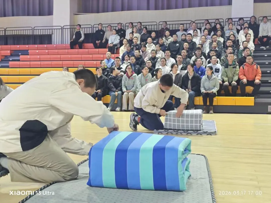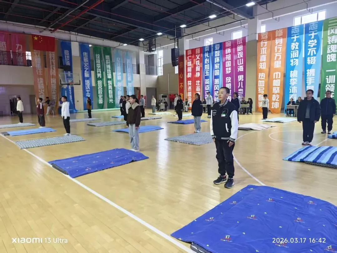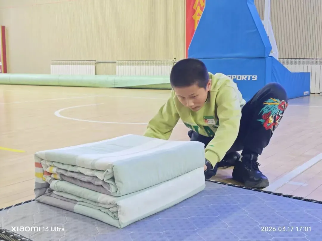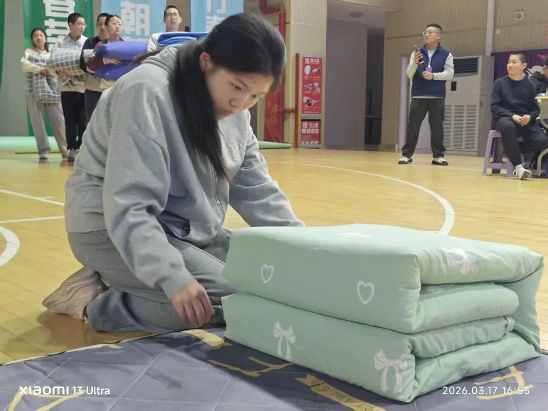 一折一叠见真章,一言一行显风采。为加强宿舍内务建设,培养学生良好生活习惯,提升动手能力与自理素养,太原市第三十七中教育集团东山校区25级初一年级举办“叠青春棱角 筑少年脊梁”叠被子大赛。3月17日下午,艺体楼掌声阵阵,全体初一学子聚集于此,叠有棱角的被子,在方寸之间展现少年风采,在点滴细节中锤炼优良品格。赛场之上,气氛热烈而有序。首先,教官宣读比赛规则与赛场纪律后,之后叠子被大赛正式拉开帷幕。各班选手依次登场,2501、2505、2509和2511班的选手率先出战,后续班级有序候场、依次比拼,整个赛程衔接紧密、井然有序。铺被、压平、对折、捏角、修边……参赛学子们动作娴熟、神情专注,每一个步骤都一丝不苟,每一个细节都精益求精。平日里柔软的被子,在同学们的手中渐渐成型,方方正正、棱角分明的“豆腐块”接连呈现,此次比赛不仅展现了学子扎实的动手能力,更彰显出选手严谨认真的做事态度。裁判老师们秉持公平、公正的原则,仔细观察每一个操作环节,从被子的平整度、棱角度和方正度等方面进行综合打分,为大赛的顺利开展保驾护航。赛场上,学子们全力以赴、各展所长;赛场下,掌声与喝彩声此起彼伏,为每一位认真拼搏的少年点赞。小小的军被,叠起的是生活技能,凝聚的是优良作风,更藏着“细节决定成败”的深刻道理。比赛尾声,副校长张鹏为本次叠军被大赛作总结讲话,对大赛的圆满举办表示祝贺,对全体参赛学子的精彩表现给予充分肯定,同时也对同学们提出殷切期望,希望大家能将叠军被中锤炼的严谨认真、精益求精的态度,融入日常的学习与生活中,从点滴小事做起,培养良好习惯,塑造优秀品格。一平一竖求严谨,一方一正塑风华。此次叠军被大赛,不仅是一场技能的比拼,更是一堂生动的养成教育课。它让同学们在实践中提升了生活自理能力,更让大家深刻体会到“无规矩不成方圆”的内涵,将“怀仁、履义、崇礼、爱智”的校风融入一言一行。叠有棱角的被,做有脊梁的人;立大志,做小事。愿我校25级初一学子以此次大赛为契机,以叠被之勤养习惯,以棱角之姿立品格,在青春的磨砺中挺起少年脊梁,将赛场之上的认真与坚持化作成长的动力,以良好的习惯、坚定的担当,在未来的道路上脚踏实地、奋勇前行,用优秀品格书写属于自己的青春华章!