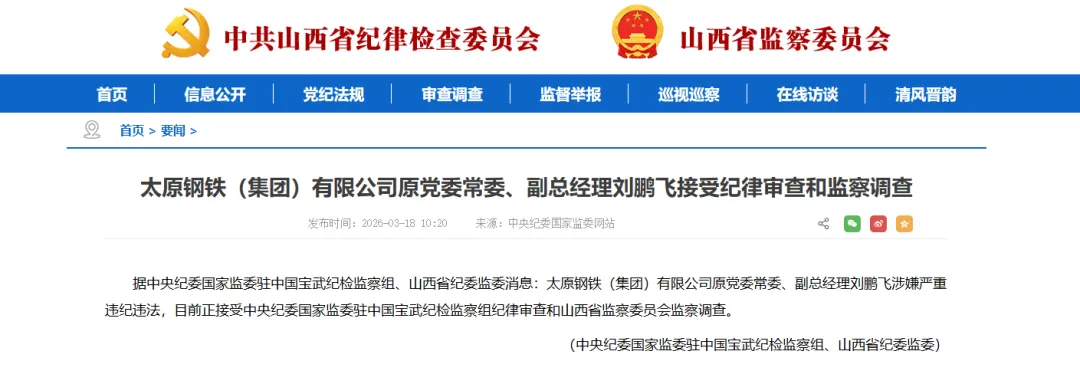 据中央纪委国家监委驻中国宝武纪检监察组、山西省纪委监委消息:太原钢铁(集团)有限公司原党委常委、副总经理刘鹏飞涉嫌严重违纪违法,目前正接受中央纪委国家监委驻中国宝武纪检监察组纪律审查和山西省监察委员会监察调查。