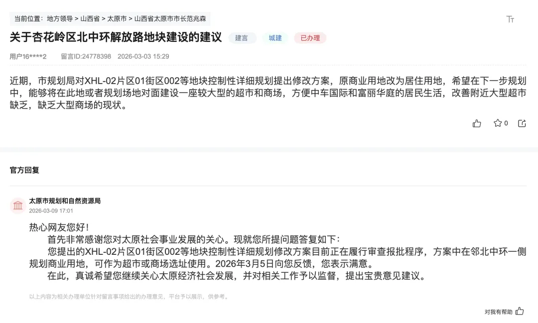 此次的公示正式宣告原先的宜家地块,从纯商业版图,转向了高品质居住综合体。直到近日,再次有网友在领导留言板提出建议:希望在下一步规划中,能够将在此地或者规划场地对面建设一座较大型的超市和商场,方便中车国际和富丽华庭的居民生活,改善附近大型超市缺乏,缺乏大型商场的现状。官方回复称:您提出的XHL-02片区01街区002等地块控制性详细规划修改方案目前正在履行审查报批程序,方案中在邻北中环一侧规划商业用地,可作为超市或商场选址使用。这一变化反映了中国城市化进程的阶段性特征。过去依靠大型商业综合体拉动区域发展的模式,在消费习惯变迁和零售业态变革的背景下正面临挑战。宜家中国的转型与太原地块的调整,共同印证了从"规模扩张"向"精准深耕"、从"大而全"向"小而美"的行业趋势。