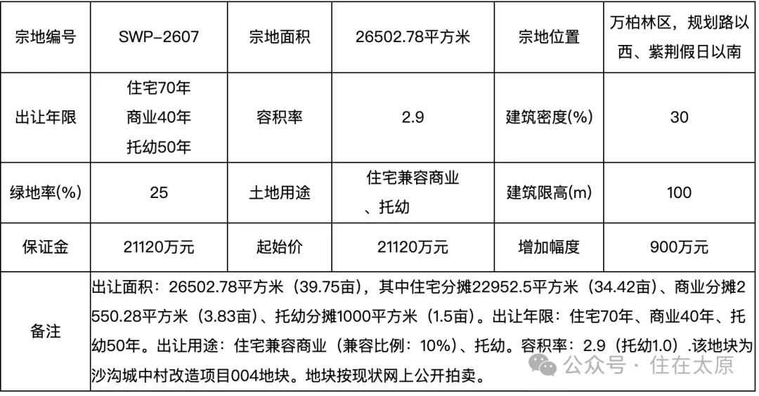该宗块地编号SWP-2607,出让面积26502.78平方米(39.75亩),住宅分摊面积 22952.5平方米(34.42亩),商业分摊面积2550.28平方米(3.83亩),托幼分摊面积1000平方米(1.5亩)。