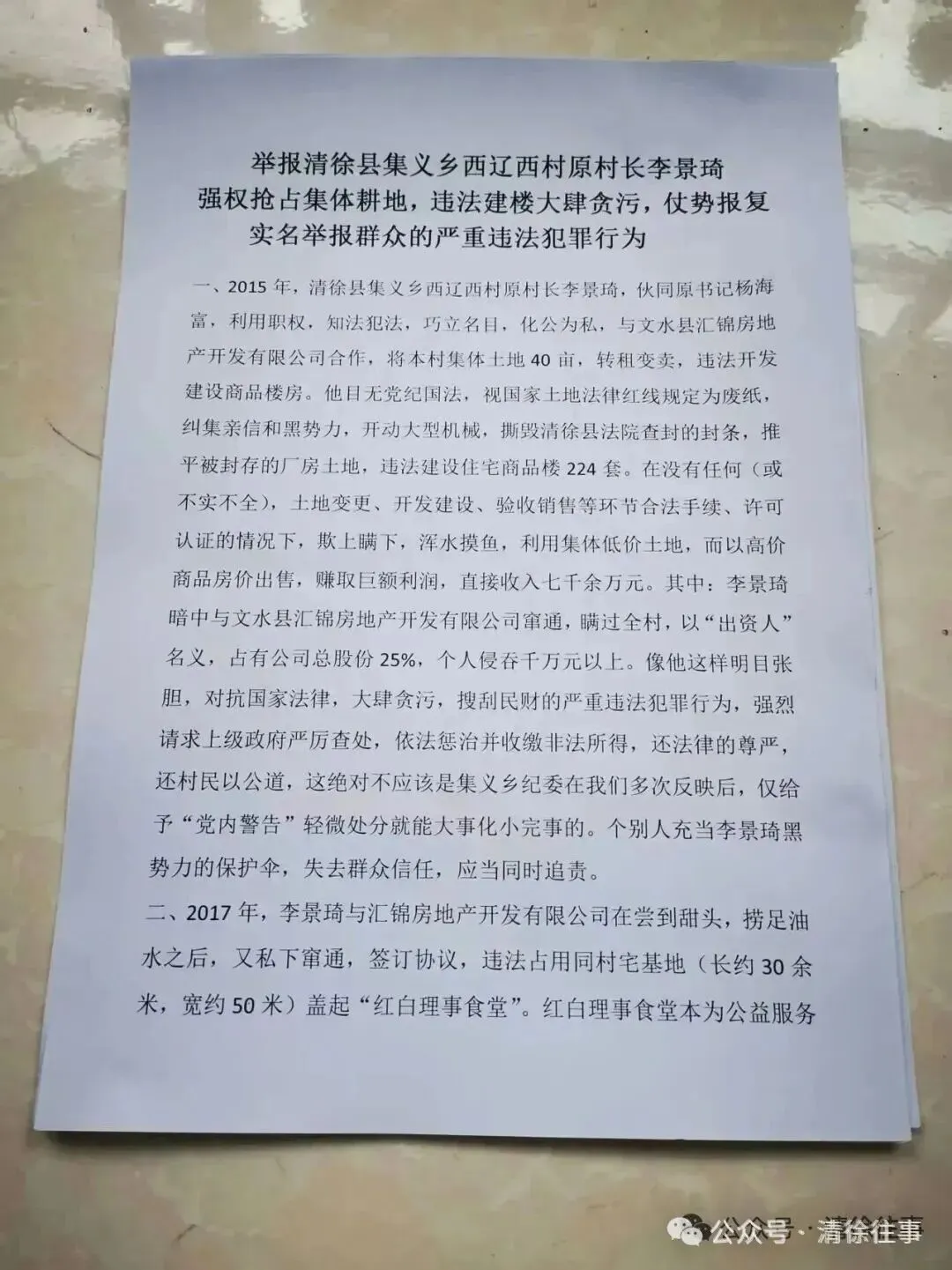 山西省太原市清徐县集义乡西辽村李景琦、杨海富等人破坏村民私有财产,强占集体土地、占用耕地违法开发辽西新区的违法事实。辽西村原有一家清徐县双龙暖气片厂,由马新亮经营。2015年6月24日该厂因拖欠银行贷款被清徐县人民法院查封。6月27日凌晨,辽西村村主任李景琦,党支部书记杨海富竟然私自撕毁了厂房的法院封条,老百姓都知道法院的封条是有法律效力的是不可以随意撕毁的,双龙暖气片厂的封条才贴了三天,就被李景琦、杨海富私自撕毁了,是这二人目无法纪还是说李景琦、杨海富是“有权利”撕毁?村民想不明白。然而撕毁封条只是小事,紧接着李景琦、杨海富组织了大约上百人,并且动用铲车、挖机、推土机等很快将价值几千万的厂房夷为平地,不得不说这两位村干部的能力和行动之迅速真是令人佩服!中途村民曾报警,派出所民警赶到现场后,看到现场也无法控制,只能任由上百号人非法强行拆除。既然民警都没有办法制止,那村民更是只能作罢。厂房拆除后,李景琦、杨海富在未办理任何手续,为获得审批的情况下,变以村委会名义私自建起商品房,并以“辽西新区建设管理委员会”的名义对外销售,所有款项全部进入李景琦和杨海富的口袋里。这几十亩土地是村里集体所有,这二人却利用手中的权利之便据为己有,利用集体的土地牟取私利,而目无法纪的二人并不因此满足,不断的扩建,先后又强行占用了耕地20亩左右,村民是不敢怒更不敢言。我国《土地管理法》明确规定国家编制土地利用总体规划,规定土地用途,将土地分为农用地、建设用地和未利用地。严格限制农用地转为建设用地,控制建设用地总量,对耕地实行特殊保护。《土地管理法》第三十七条 非农业建设必须节约使用土地,可以利用荒地的,不得占用耕地;可以利用劣地的,不得占用好地。禁止占用耕地建窑、建坟或者擅自在耕地上建房、挖砂、采石、采矿、取土等违法占地的立案标准为: