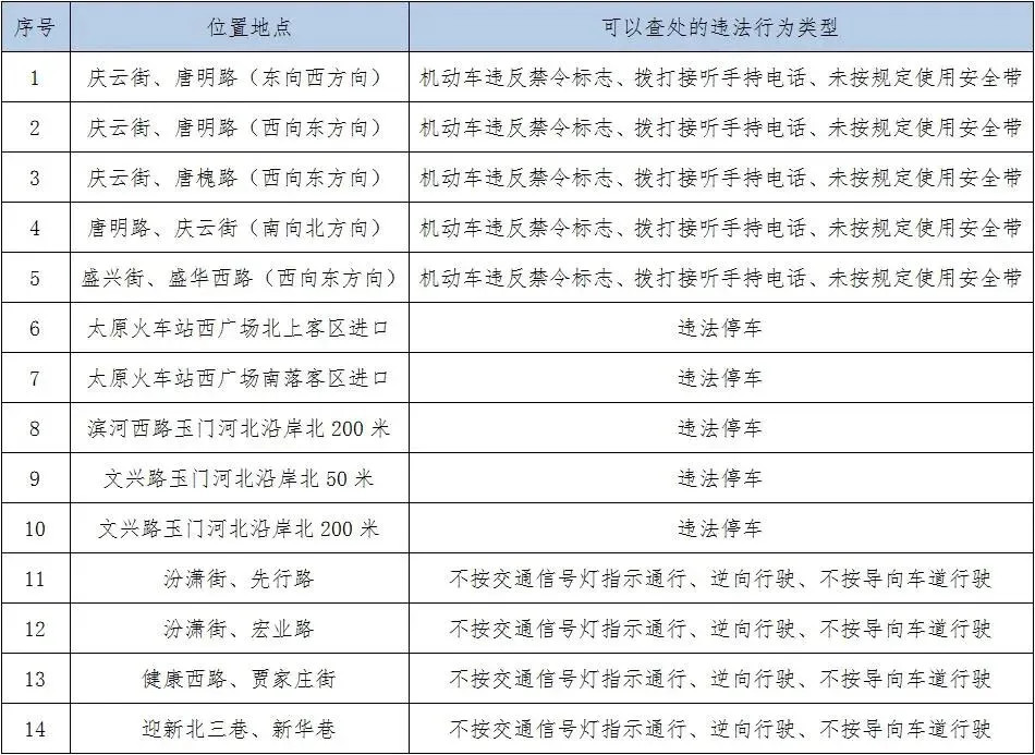 本次新增的固定式交通技术监控设备公示时间自2026年3月17日至2026年3月24日。公示期结束,太原市公安局交通管理支队将正式启用以上固定式交通技术监控设备,对设置地点相关路口、路段机动车违反禁令标志、拨打接听手持电话、未按规定使用安全带等交通违法行为进行摄录取证及查处。望广大交通参与者及道路沿线商户、居民支持配合。请自觉遵守交通安全法律、法规,注意行车安全,珍爱生命,平安出行。