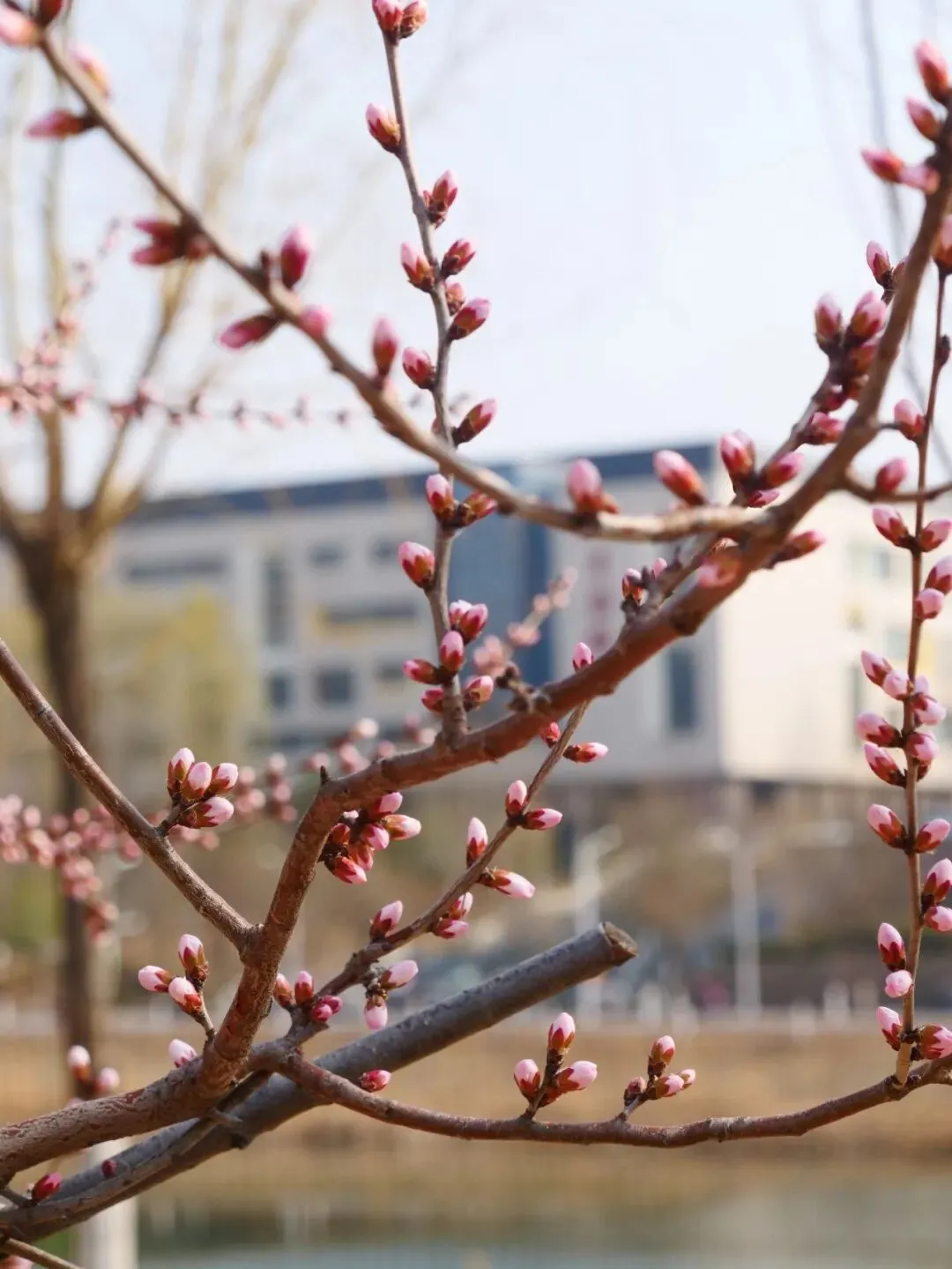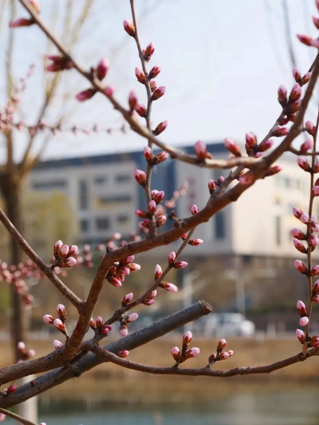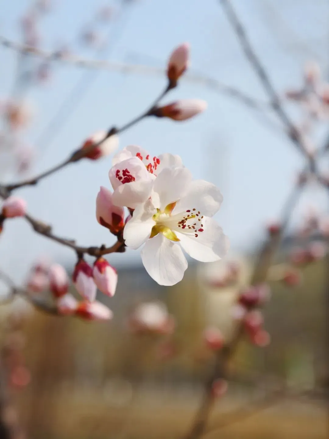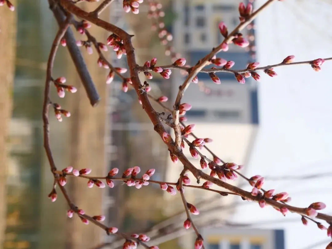 花瓣:五瓣,白里透粉,花蕊带着红色斑点,质感轻薄透亮。花苞:呈纺锤形,红粉色萼片包裹,和第一张图里的花苞形态完全一致。花期:早春 3 月先叶开放,是北方高校里最早报春的花之一。怎么样,是不是满满期待住了!