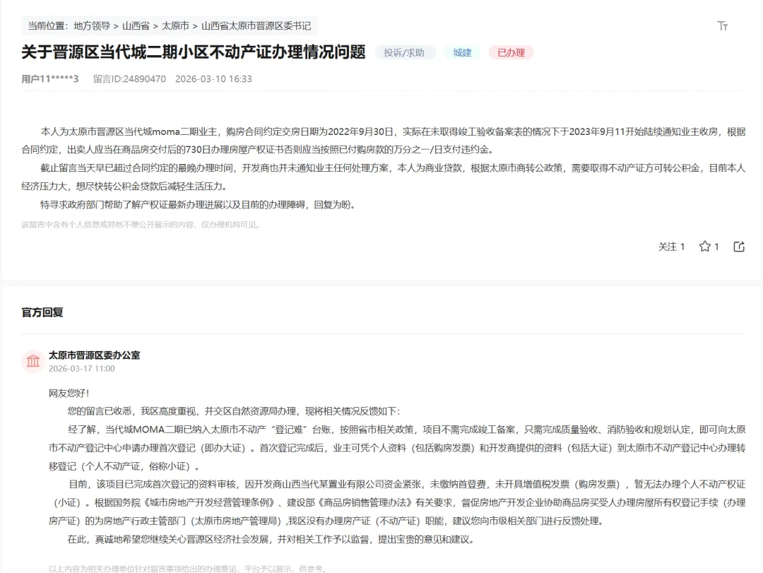 近日有网友在领导留言板提问:本人为太原市晋源区当代城moma二期业主,购房合同约定交房日期为2022年9月30日,实际在未取得竣工验收备案表的情况下于2023年9月11开始陆续通知业主收房,根据合同约定,出卖人应当在商品房交付后的730日办理房屋产权证书否则应当按照已付购房款的万分之一/日支付违约金。 截止留言当天早已超过合同约定的最晚办理时间,开发商也并未通知业主任何处理方案,本人为商业贷款,根据太原市商转公政策,需要取得不动产证方可转公积金,目前本人经济压力大,想尽快转公积金贷款后减轻生活压力。