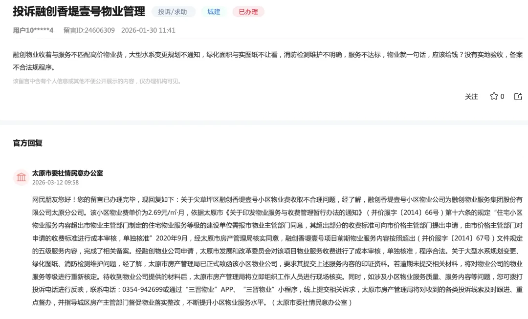 融创在太原有多个楼盘,近年来随着融创开发商资金链紧张,物业服务也屡屡被投诉。融创中心,2025年5月、10月,连续两次被小店区住建局列入物业黑榜,上榜原因主要是违规收费、服务质量不达标、公共区域维护差。值得一提的是,根据太原市规定,一年内3次黑榜,可启动重新选聘物业。融创香堤壹号,2025年10月被太原市房产管理局通报,列入物业黑榜并要求整改。上榜原因主要是:共用设施巡查不足、公区卫生不达标、绿化斑秃。融创学府壹号院,2024年10月被太原市万柏林区住房和城乡建设局要求“降低收费标准”,要求从2025年1月1日起,物业服务收费标准降低0.25元/㎡/月(不含电梯)。近日,有市民投诉:融创香堤壹号物业管理,具体如下:融创物业收着与服务不匹配高价物业费,大型水系变更规划不通知,绿化面积与实图纸不让看,消防检测维护不明确,服务不达标,物业就一句话,应该给钱?没有实地验收,备案不合法规程序。关于尖草坪区融创香堤壹号小区物业费收取不合理问题,经了解,融创香堤壹号小区物业公司为融创物业服务集团股份有限公司太原分公司。该小区物业费单价为2.69元/㎡·月,依据太原市《关于印发物业服务与收费管理暂行办法的通知》(并价服字〔2014〕66号)第十六条的规定“住宅小区物业服务内容超出市物业主管部门制定的住宅物业服务等级的建设单位需报市物业主管部门同意,其超出部分的收费标准可向市价格主管部门提出申请,由市价格主管部门对申请的收费标准进行成本审核,单独核准”2020年9月,经太原市房产管理局核实同意,融创香堤壹号项目前期物业服务内容按照超出(并价服字〔2014〕67号)文件规定的五级服务内容,完成了相关备案。经融创物业公司申请,太原市发展和改革委员会对该项目物业服务收费进行了成本审核,单独核准,程序合法。关于大型水系规划变更、绿化图纸、消防检测维护问题,经了解,太原市房产管理局已正式致函该小区物业公司,要求其提交上述服务内容的印证资料。若逾期未提交相关材料,将对物业公司的物业服务等级进行重新核定。待收到物业公司提供的材料后,太原市房产管理局将立即组织工作人员进行现场核实。同时,如涉及小区物业服务质量、服务内容等问题,您可拨打投诉电话进行反映,联系电话:0354-942699或通过“三晋物业”APP、“三晋物业”小程序,线上提交相关诉求,太原市房产管理局将对收到的各类投诉线索及时跟进、重点督办,并指导城区房产主管部门督促物业落实整改,不断提升小区物业服务水平。(太原市委社情民意办公室)值得一提的是,和融创香堤壹号类似,恒大青运城也是因为有水系,均以 “五级 + 超五级服务” 备案高价物业费,核心卖点都包含大型水系、景观、消防维保等增值服务。后期业主普遍反映服务缩水、质价不符,存在水系规划变更、绿化养护差、消防维护不透明等问题,经业主投诉与政府部门介入约谈后,恒大青运城已成功将物业费从2.8元/㎡・月下调至2.5元/㎡・月,多缴费用还予以顺延抵扣。从目前的情况看,融创香堤壹号同样存在大型水系规划变更、绿化图纸、消防检测维护问题,同样被列入物业黑榜要求整改过,所以也符合降价条件。