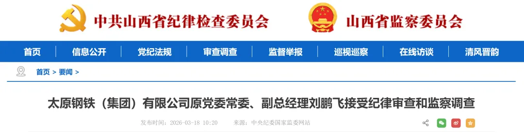 >太原钢铁(集团)有限公司原党委常委、副总经理刘鹏飞接受纪律审查和监察调查