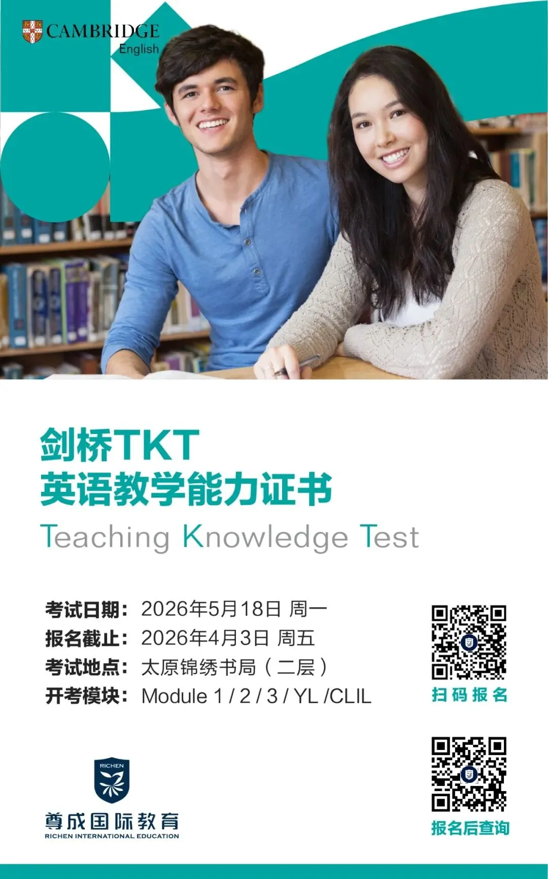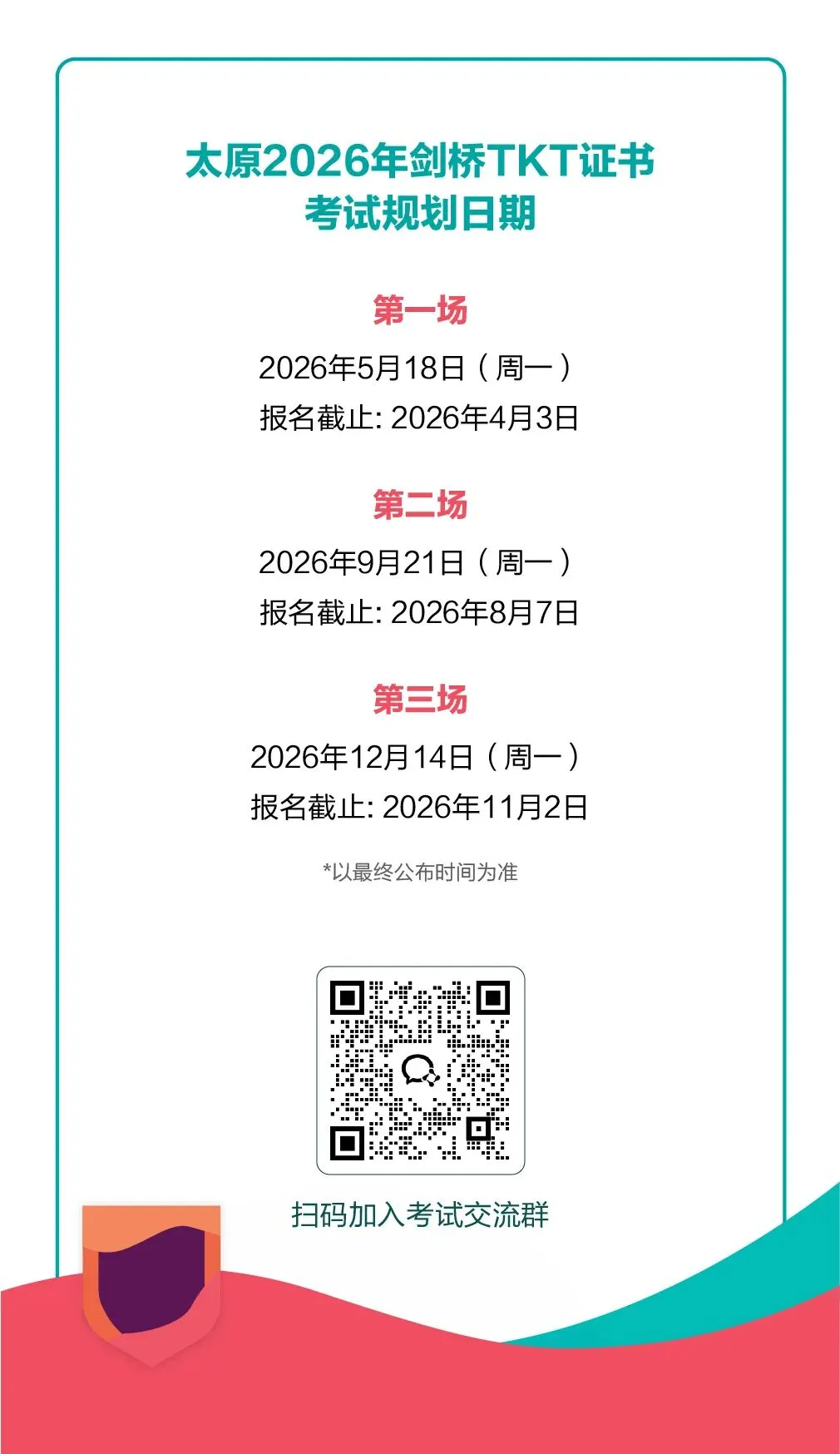 2026年5月18日就有一场TKT考试,在截止日期之前(2026.4.3)扫码提交信息缴费报名就可以了。如果有疑问,随时打电话联系我们:13209816717