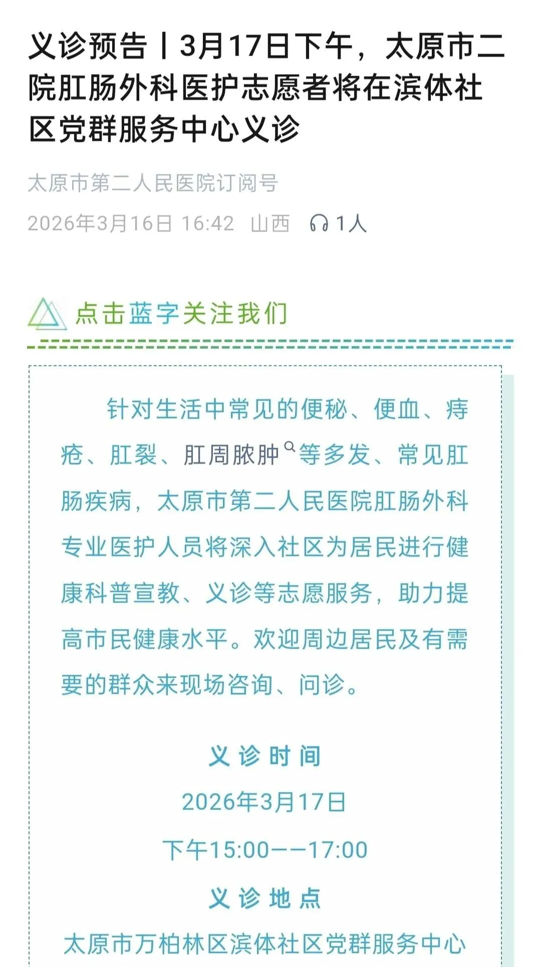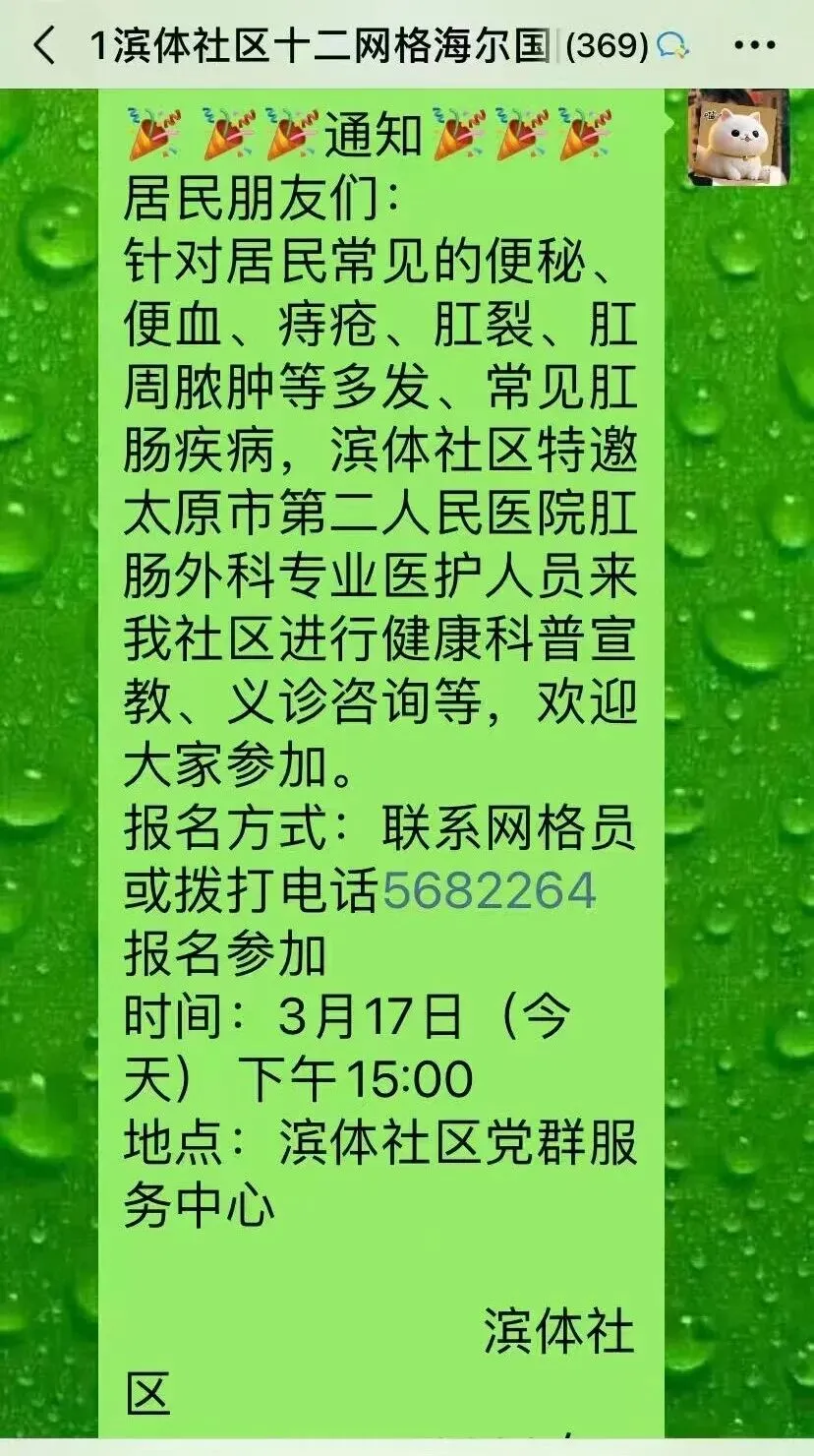 为提升居民健康意识,普及肛肠疾病防治知识,3月17日下午,太原市第二人民医院肛肠外科医护人员走进滨体社区党群服务中心开展“关爱肛肠健康”义诊活动,为辖区居民提供健康讲座、免费问诊、健康检查、发放健教资料等服务,将优质医疗资源送到居民家门口。