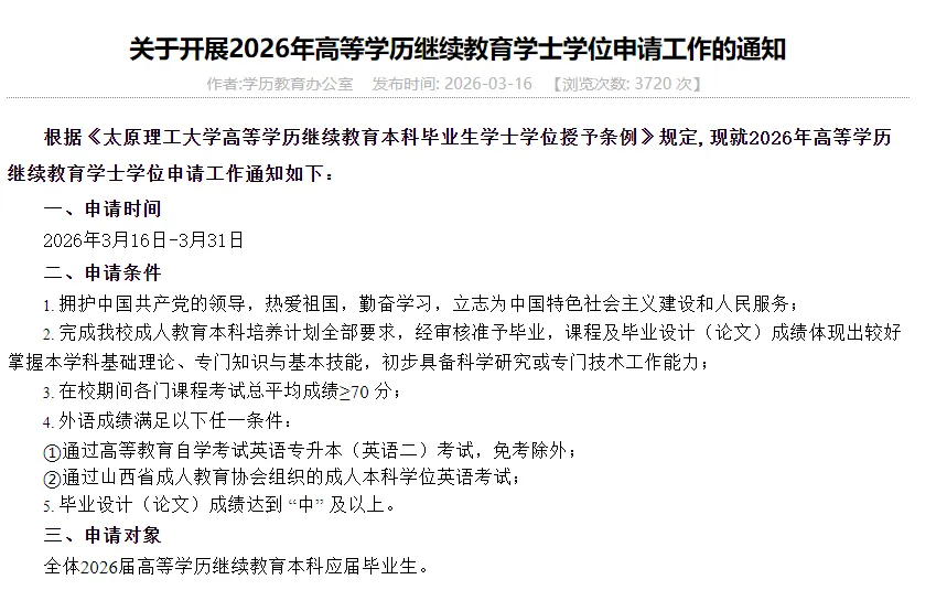 根据《太原理工大学高等学历继续教育本科毕业生学士学位授予条例》规定,现就2026年高等学历继续教育学士学位申请工作通知如下:
