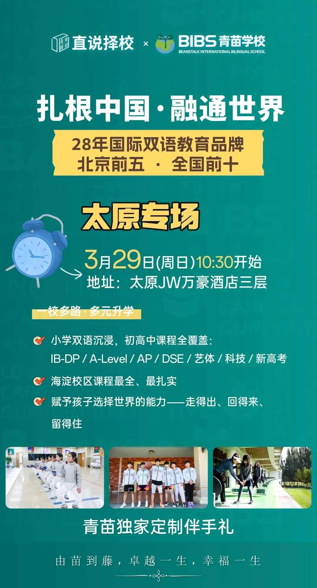 北京青苗学校实现IB全学段无缝衔接,以分层教学支持差异化升学。本次展会还将特地开辟青苗学校太原专场,家长可与学校招生老师深度面谈!
