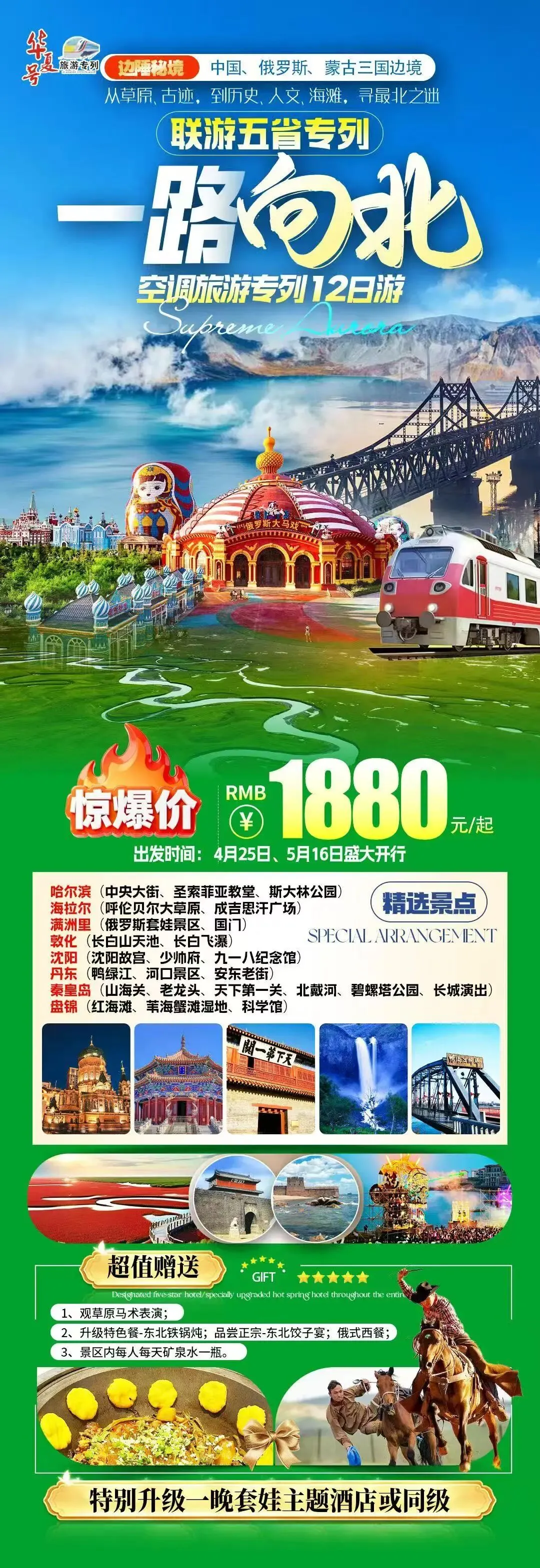 >太原出发-一路向北中国俄罗斯蒙古三国边境空调旅游专列12日游1880元/人
