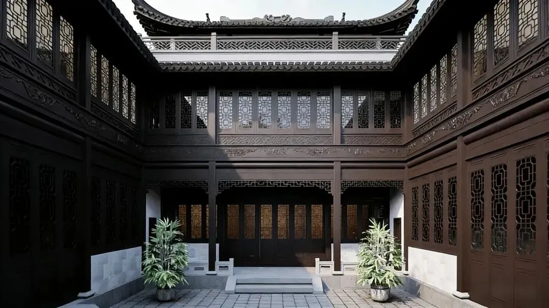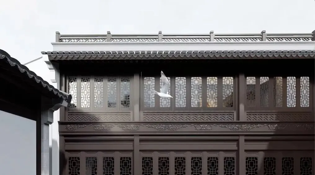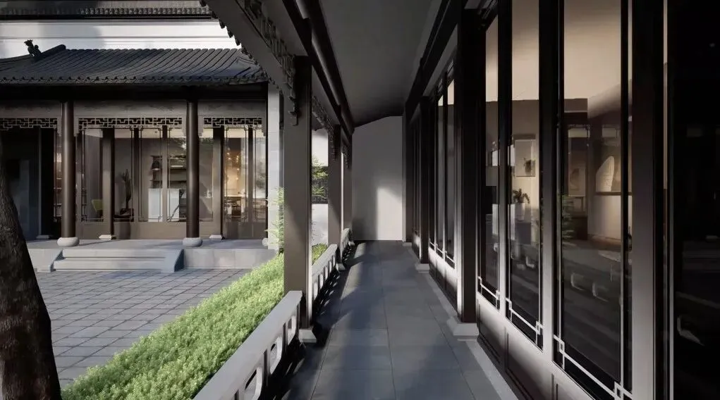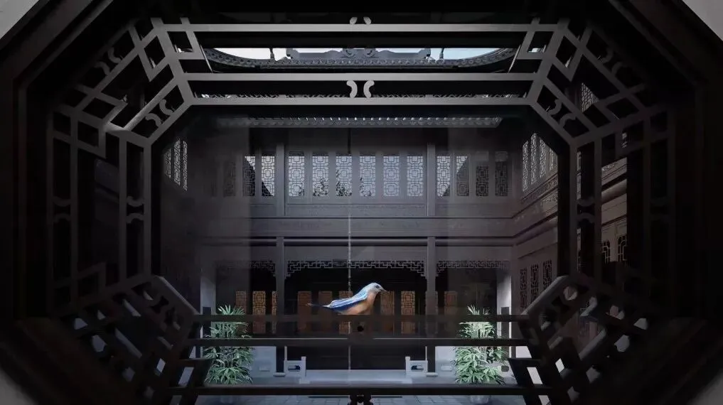 The octagonal window lattice, adorned with intricate patterns and geometric designs, serves as an elegant divider. It not only delineates the viewing space but also functions as a "picture frame," framing the courtyard behind like a flowing Chinese-style scroll painting. This is a contemporary interpretation of the classical garden technique of "borrowing scenery and framing scenery.".