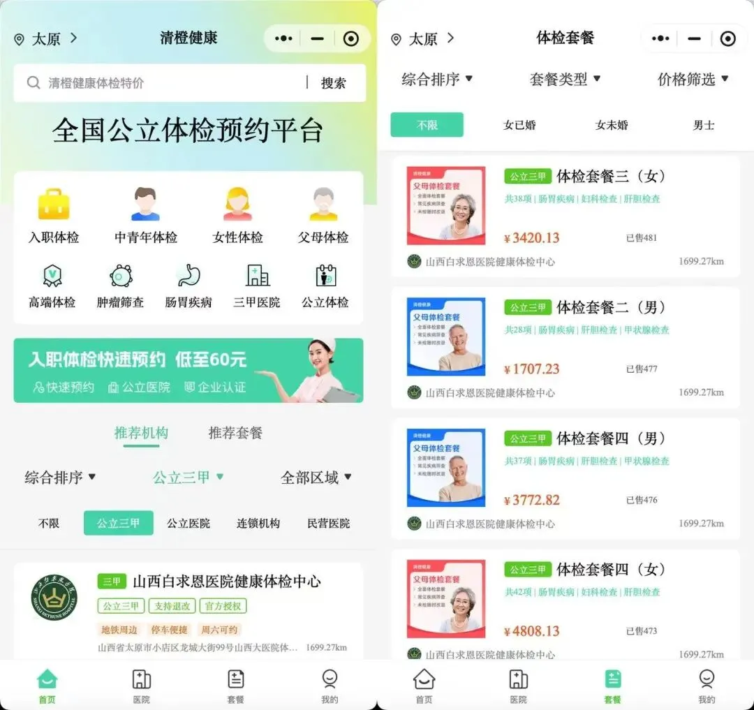 大家可以通过清橙健康小程序预约各大三甲医院的体检套餐,全国200+城市,1400+多家三甲医院授权预约。