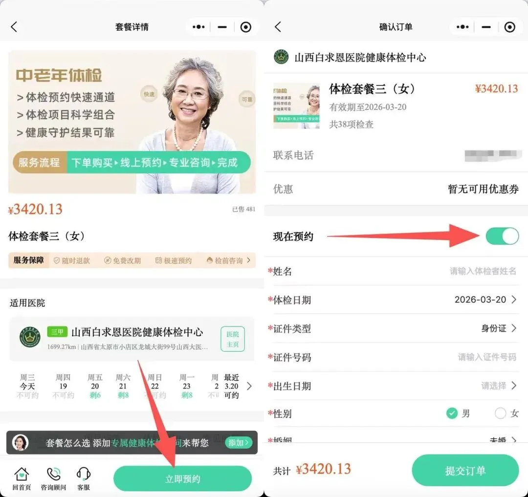 点击相应套餐右下角的【立即购买】,勾选【现在预约】按钮,填写体检人信息、体检日期等,立即支付,即可完成预约。