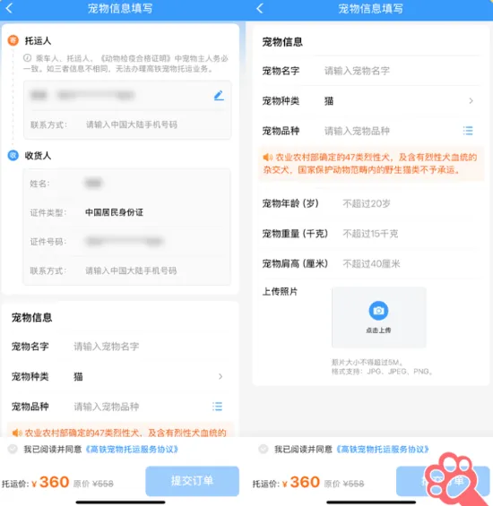 4.进入宠物信息填写页面后,填写托运人、收货人以及宠物信息,完成后点击【提交订单】即可