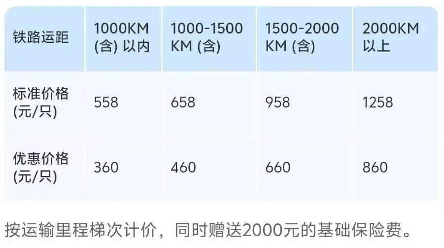 按运输里程梯次计价,运距1000公里(含)558元/只,运距1000~1500公里(含)658元/只,1500~2000公里(含)958元/只,2000公里以上1258元/只,同时赠送保额2000元的基础保险。试点期间,非购票旅客按标准价格执行;对同车次同区间购票旅客给予特定优惠,按标准价格7折执行。