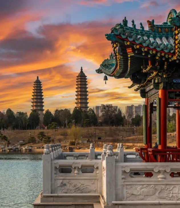 双塔寺远看最美,明代砖塔并肩立着,日落时塔影往地上一压,很有气势。