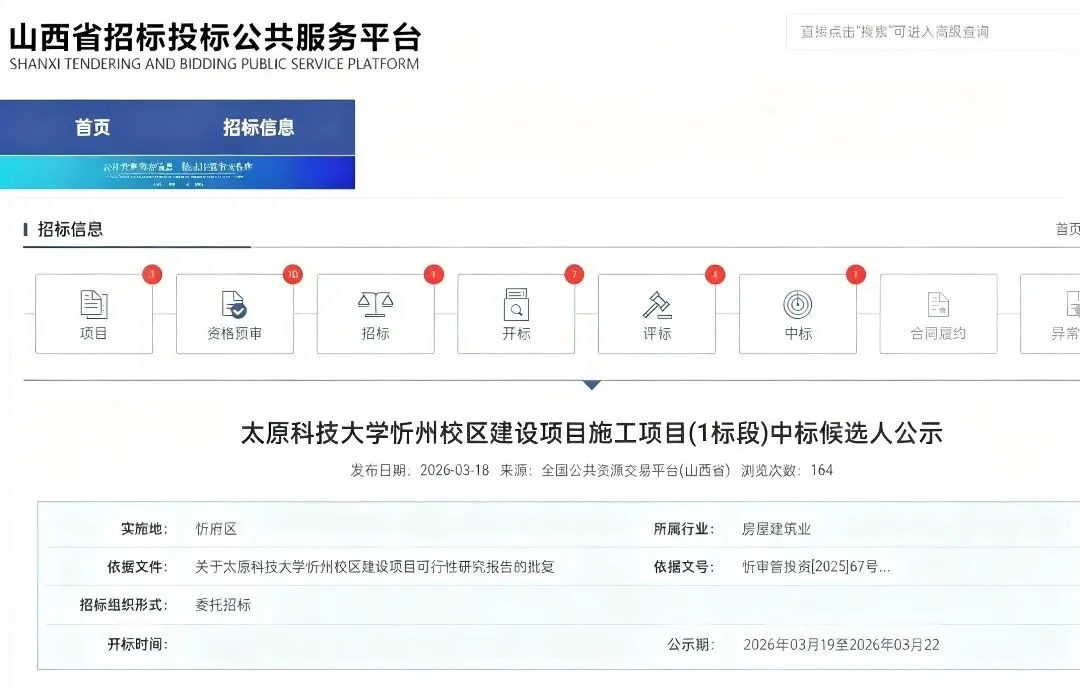 重磅消息!太原科技大学忻州校区建设项目再传捷报!2026年3月18日,山西省招标投标公共服务平台正式发布《太原科技大学忻州校区建设项目施工项目(1标段)中标候选人公示》,标志着这一备受瞩目的重点工程距离实质性开工仅一步之遥!