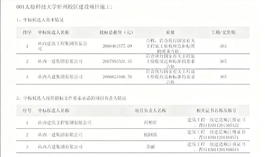 公示显示,该项目施工(1标段)中标候选人前三名均为山西省内建筑强企,具体报价及负责人信息如下: