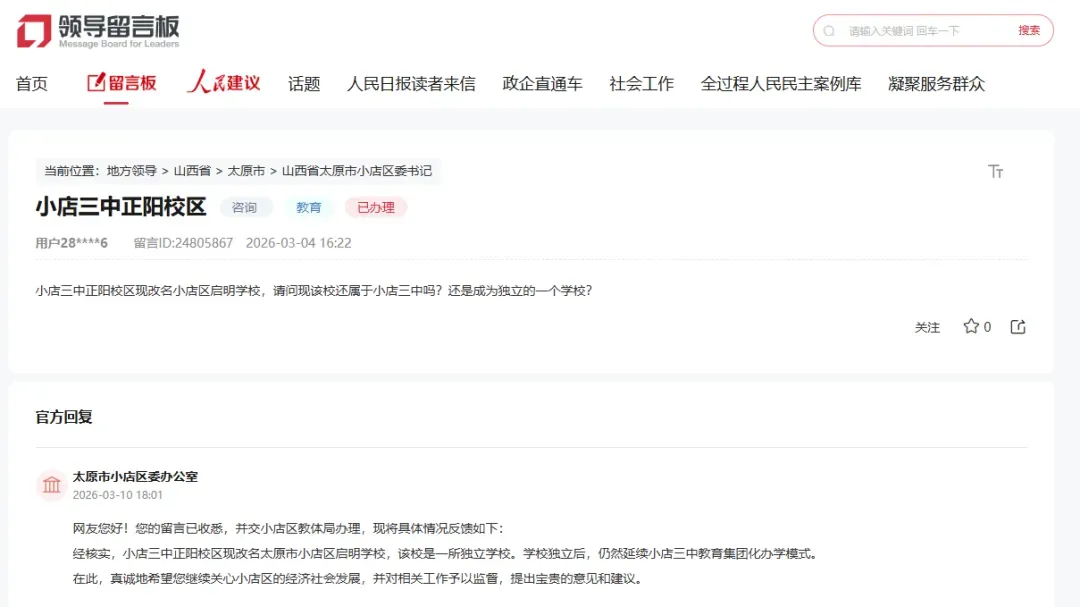网友您好!您的留言已收悉,并交小店区教体局办理,现将具体情况反馈如下: 经核实,小店三中正阳校区现改名太原市小店区启明学校,该校是一所独立学校。学校独立后,仍然延续小店三中教育集团化办学模式。在此,真诚地希望您继续关心小店区的经济社会发展,并对相关工作予以监督,提出宝贵的意见和建议。