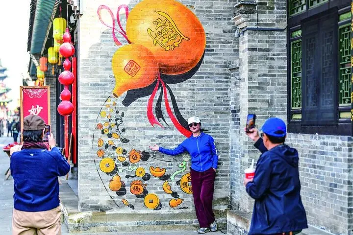 张师傅是山西太原的一名网约车司机,也是土生土长的太原人。每当听到外地来旅游的乘客聊起太原晋祠、应县木塔、大同悬空寺,张师傅总会热情地介绍:“咱山西那是中国古建筑宝库,公认的中国‘古代建筑艺术博物馆’!”2月25日,游客在山西太原古县城拍照留念。曹阳摄
