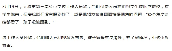 近日,网友发视频称,在太原市第三实验小学校门口,一名小学生在跑入校门时疑似被保安踢到,后撞到另一位学生。视频发布者配文“暴躁的保安遇到调皮的小学生”,并称“实拍校门口一幕,没有那一脚他们或许不会摔倒”。