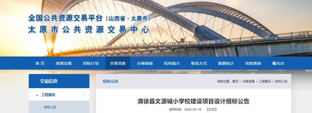 3月19日,记者从全国公共资源交易平台、太原市公共资源交易中心获悉,清徐县文源城小学校建设项目设计招标公告已公示。本项目总投资21964.3万元。