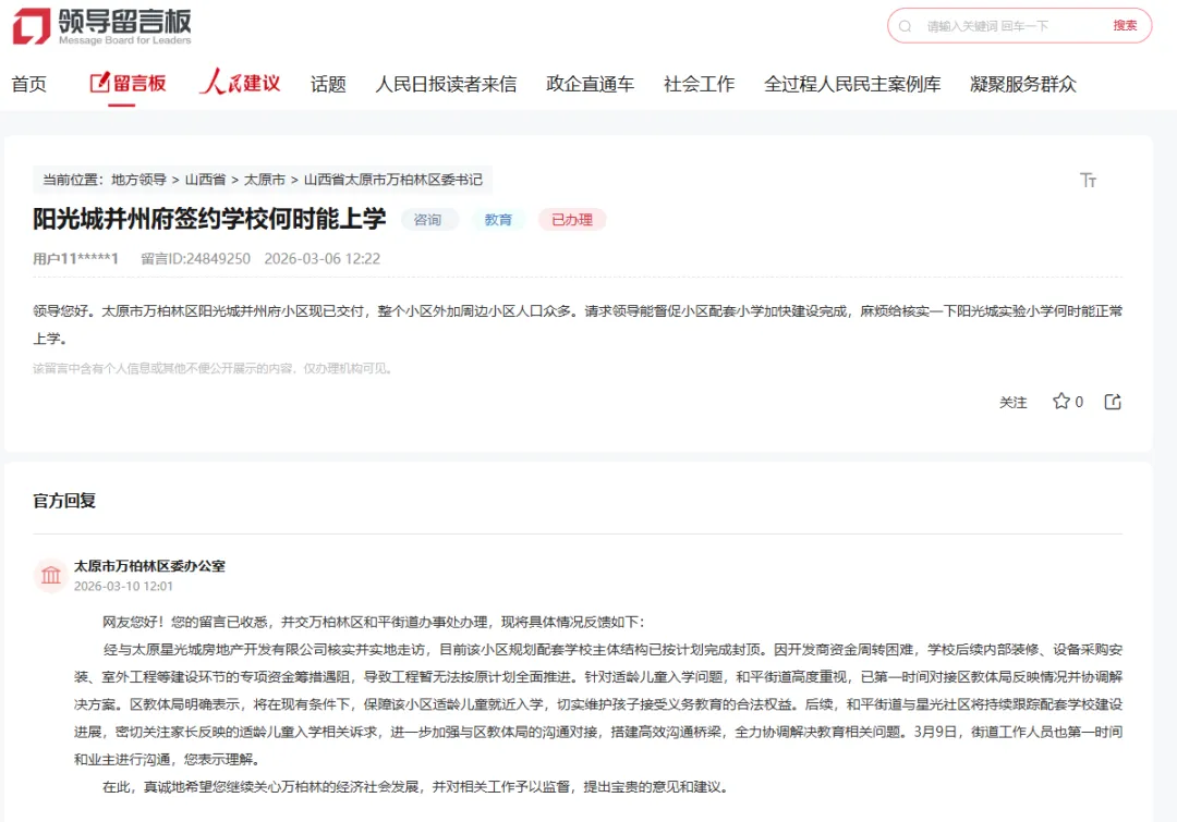 经与太原星光城房地产开发有限公司核实并实地走访,目前该小区规划配套学校主体结构已按计划完成封顶。因开发商资金周转困难,学校后续内部装修、设备采购安装、室外工程等建设环节的专项资金筹措遇阻,导致工程暂无法按原计划全面推进。针对适龄儿童入学问题,和平街道高度重视,已第一时间对接区教体局反映情况并协调解决方案。区教体局明确表示,将在现有条件下,保障该小区适龄儿童就近入学,切实维护孩子接受义务教育的合法权益。后续,和平街道与星光社区将持续跟踪配套学校建设进展,密切关注家长反映的适龄儿童入学相关诉求,进一步加强与区教体局的沟通对接,搭建高效沟通桥梁,全力协调解决教育相关问题。3月9日,街道工作人员也第一时间和业主进行沟通,您表示理解。在此,真诚地希望您继续关心万柏林的经济社会发展,并对相关工作予以监督,提出宝贵的意见和建议。