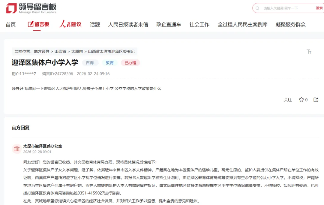 网友您好!您的留言已收悉,并交区教育体育局办理,现将具体情况反馈如下:关于迎泽区集体户子女入学问题,经了解,依据近年来省市区入学文件精神,户籍所在地为本区集体户的适龄儿童,确无住房的,监护人要提供在集体户所在单位工作的有效证明,由集体户户籍所对应学区小学视学位情况进行安排,若报名人数超出学校招生计划时,由迎泽区教育体育局统筹安排到有空余学位的公办小学入学,不得择校;户籍所在地为本区集体户但属于有房户的,监护人需提供监护人本人有效房屋产权证,由实际居住地区教育体育局根据本区小学学位情况统筹安排,不得择校。如您还有疑惑,也可拨打迎泽区教育体育局咨询热线0351-4159027进行咨询。在此,真诚地希望您继续关心迎泽区的经济社会发展,并对相关工作予以监督,提出宝贵的意见和建议。