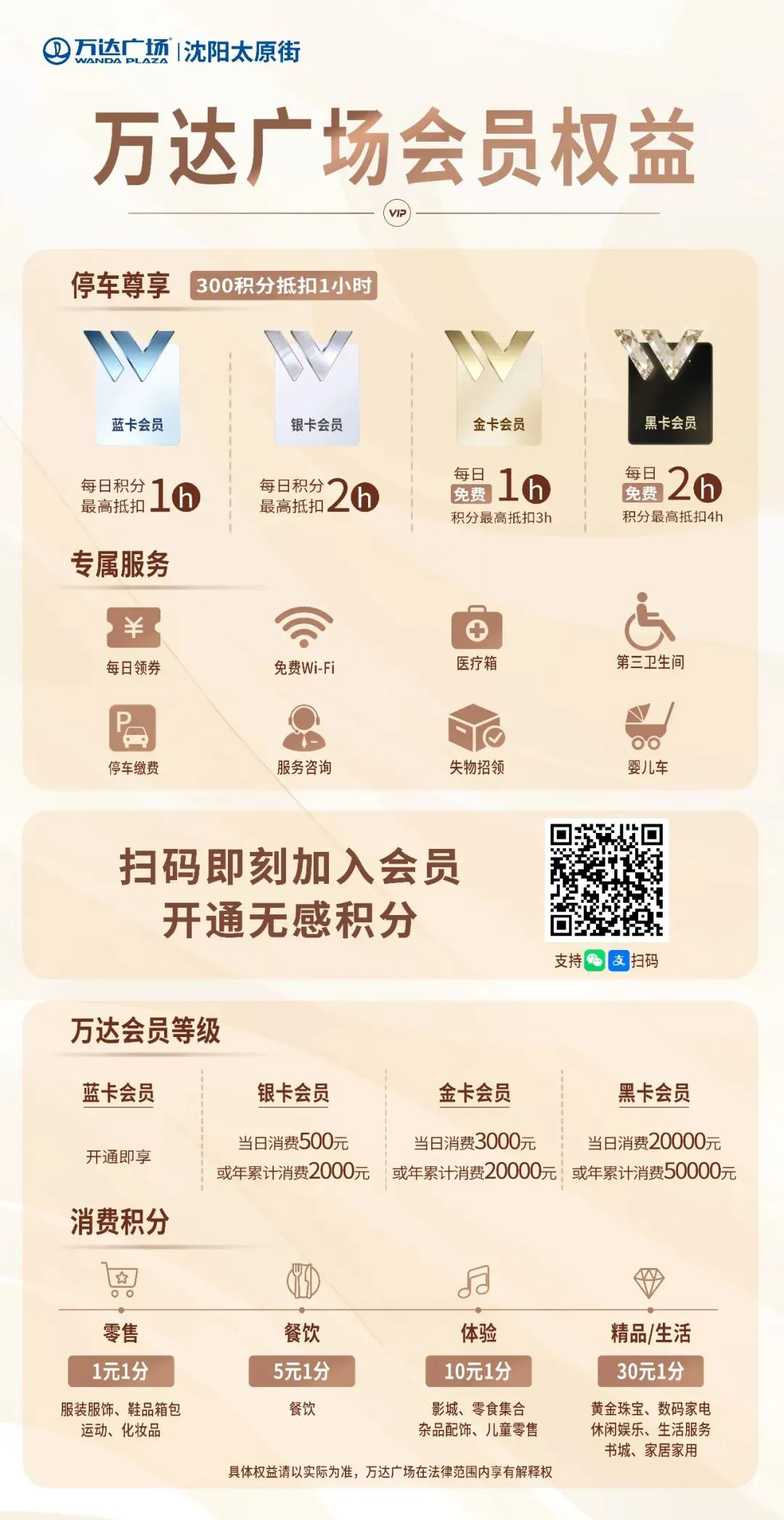 >【太原街万达广场会员权益】免费停车+积分换礼!