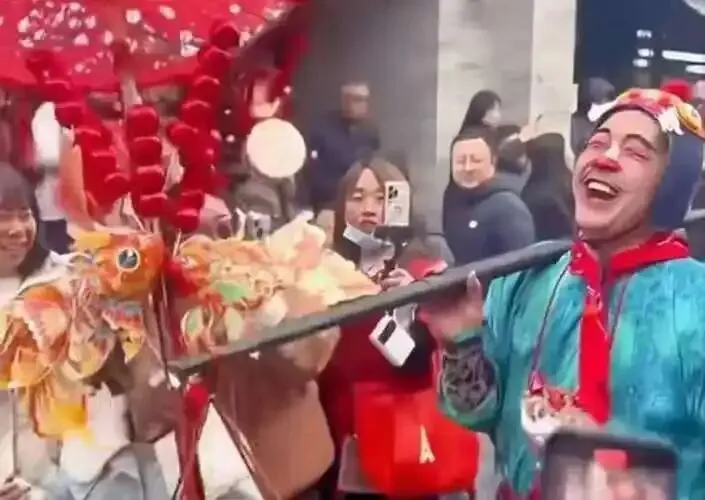 春节假期,每天三场演出,每场半小时以上,挑着40多斤的重担在古街里走街串巷,说不累是假的。但只要你看到他的视频,就会发现,他的笑容没有一秒是敷衍的。