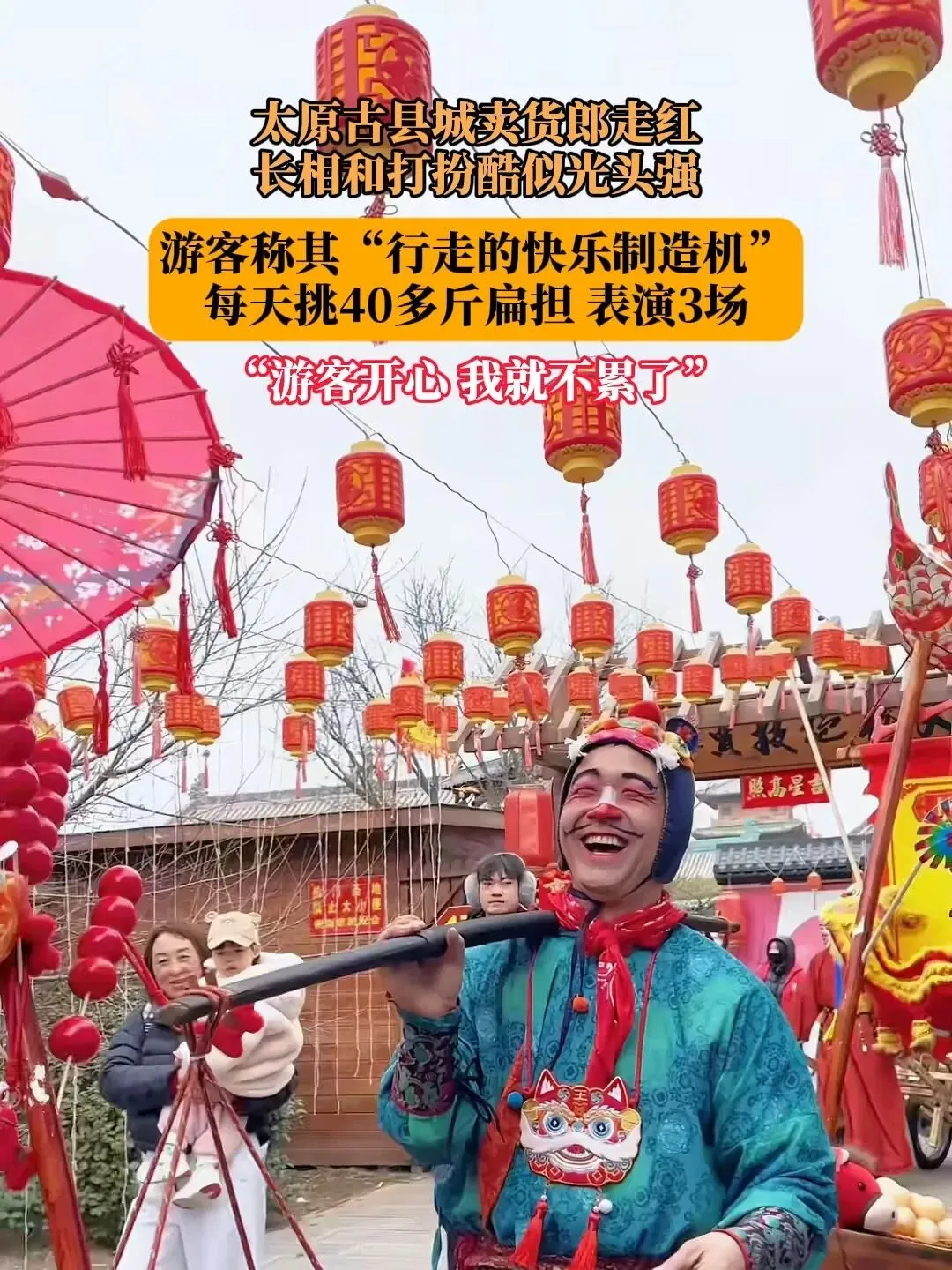 如果你还没看过他的表演,不妨在这个春天,去一趟太原古县城。去偶遇那个挑着扁担的“显眼包”,去收获一份发自内心的开怀大笑。